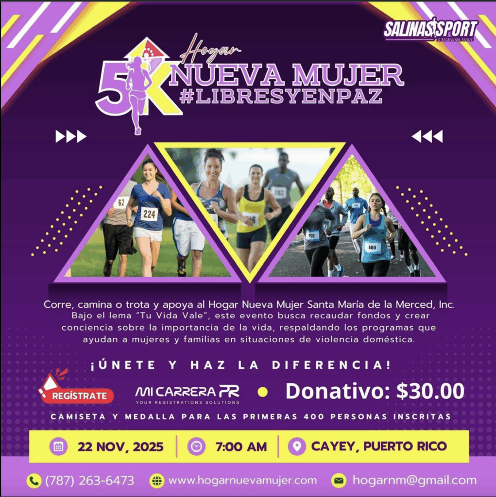 Participa del 5K Nueva Mujer #LibresYEnPaz, una carrera a beneficio del Hogar Nueva Mujer que respalda a mujeres y familias en situaciones de violencia doméstica. El 5K sale desde el Parque Pedro Montañez, en Cayey, y tiene un donativo de inscripción es de $30. Los primeros 400 inscriptores recibirán camisetas y medallas conmemorativas. También, habrá premiaciones en metálico para las categorías masculino y femenino.