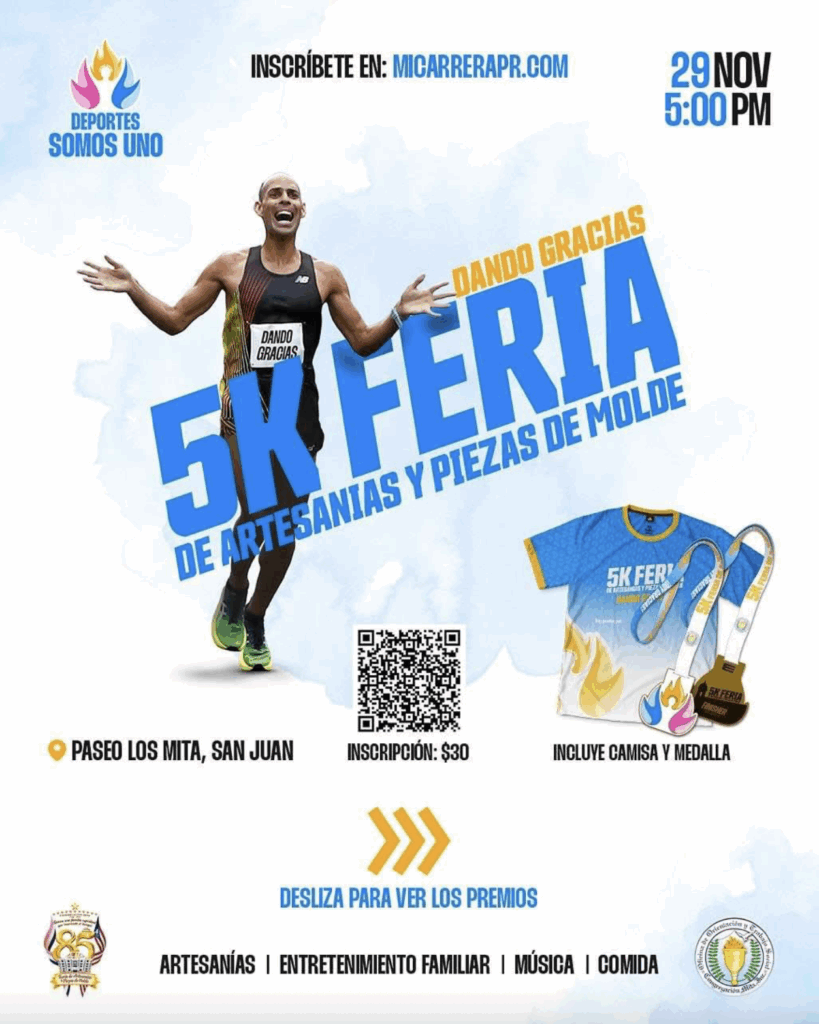 La organización Deportes Somos Uno invita a corredores, clubes de running y aficionados a participar de esta edición 5K Feria de Artesanías y Piezas de Molde, con el tema «Dando Gracias». Se espera que acudan unos 500 atletas locales e internacionales al evento. Habrá camisetas y medallas para todos los participantes y premiaciones para los primeros tres ganadores en las categorías masculino, femenino y silla de ruedas. La inscripción tiene un costo de $30; puedes acceder aquí para registrarte.