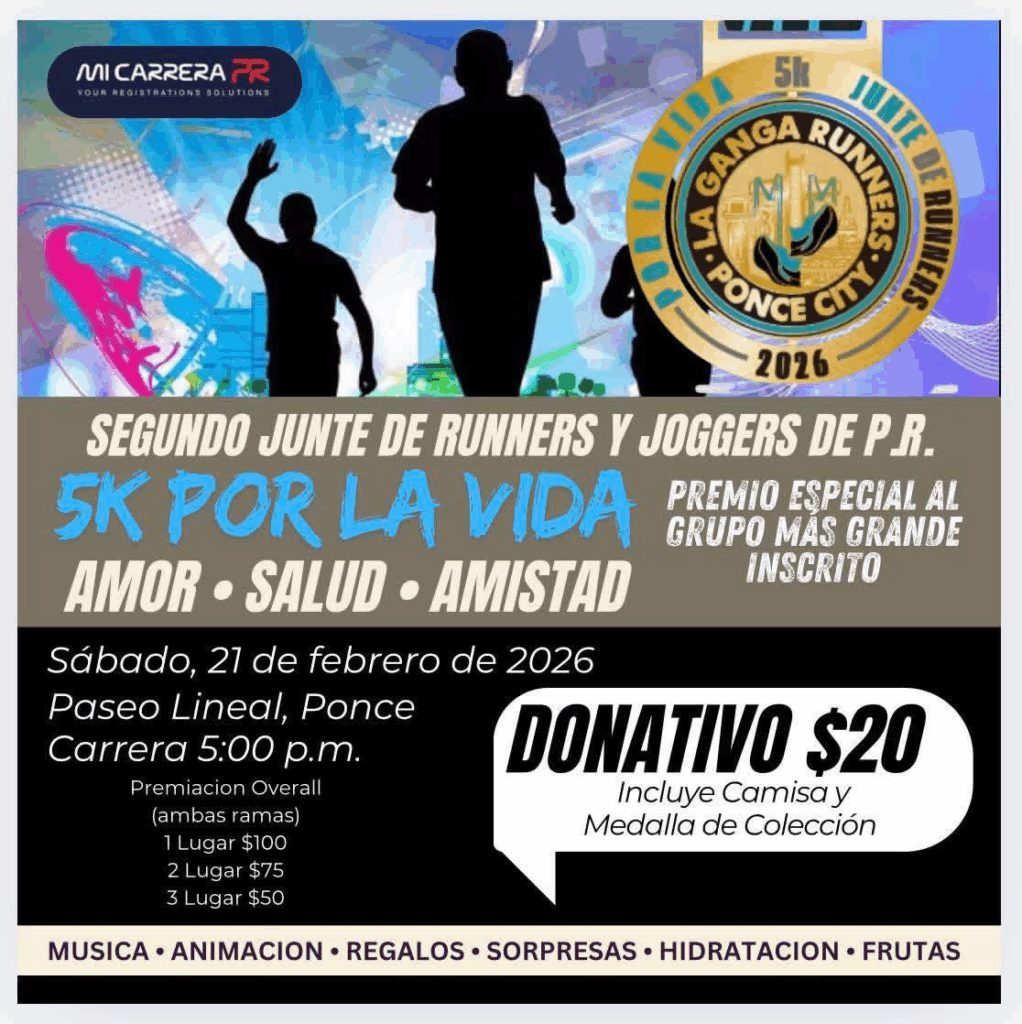 La Ganga Runners está organizando su segundo encuentro en Ponce. Corre en un ambiente familiar desde el mediodía con música, comida y mucha energía. Por $20 te dan una camisa y una medalla, más todas las sorpresas que tienen preparadas. El grupo más grande que se inscriba gana un premio especial.