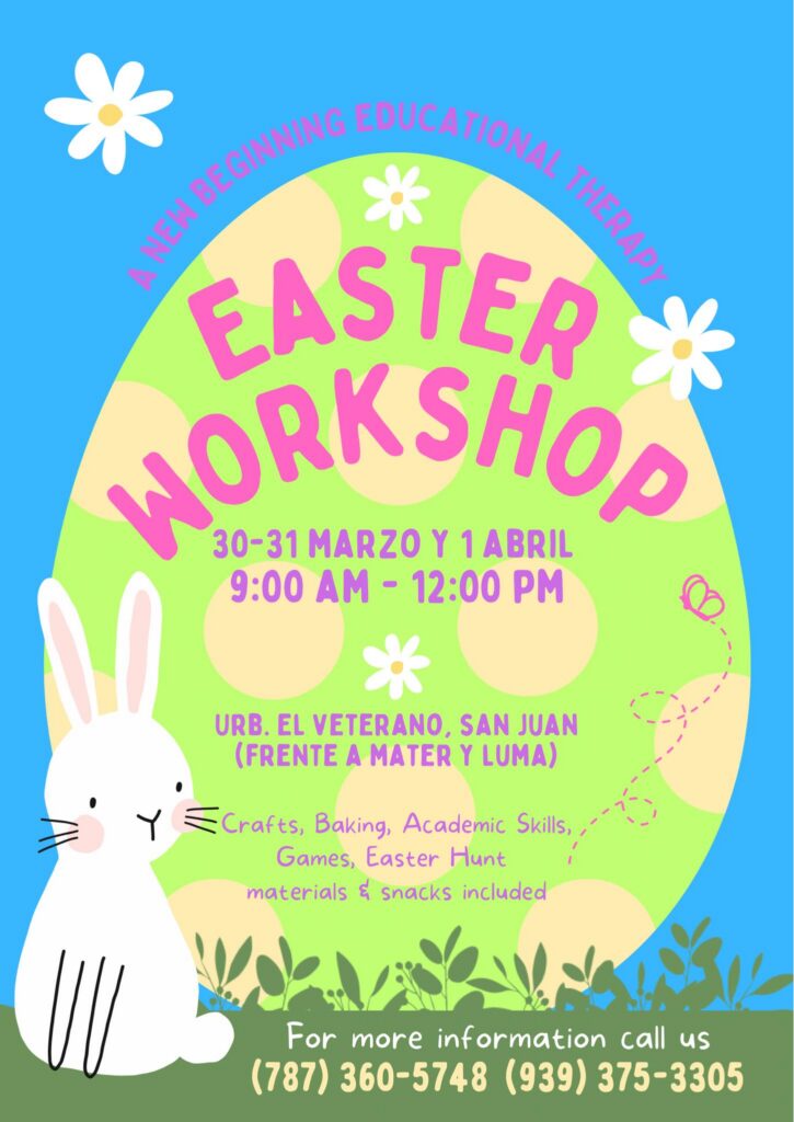 Un taller educativo y creativo perfecto para Semana Santa con actividades como manualidades temáticas, búsqueda de huevos de Pascua, taller educativo y creativo, juegos. El programa está a cargo de Vanessa Padilla, MA Ed, CP, ETE (Terapeuta Educativa Certificada. Para más información puedes llamar al (939)-375-3305
