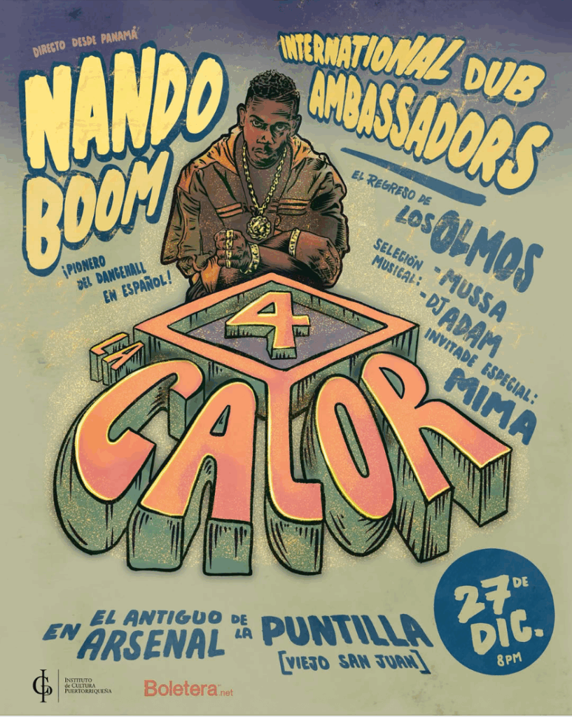27 de diciembre 2025: Presentando, desde Panamá, leyenda y pionero del reggae y dancehall en español, NANDO BOOM. También en tarima: International Dub Ambassadors, Los Olmos e invitada de honor: MIMA. La celección musical de la noche estará a cargo de: DJ Adam y Mussa. Espera mucha música caribeña, psicodelia navideña, mercado local, refrigerios, food trucks y más. En el Arsenal de la Puntilla, en Viejo San Juan, a partir de las 8:00 p.m. Boletos disponibles en Boletera.