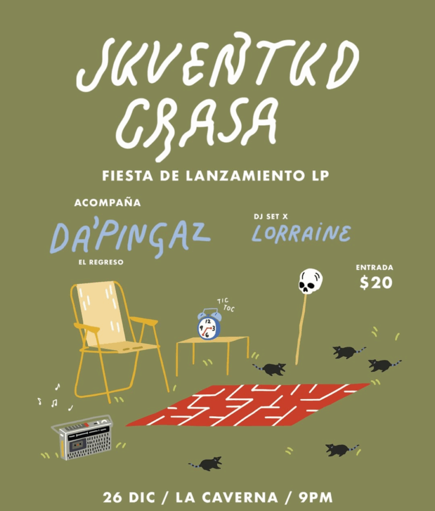 26 de diciembre: (Venue por confirmar), San Juan. Juventud Crasa presenta el lanzamiento del LP Después de tanto tiempo – Añada agua y mezcle, con Da’ Pingaz (regreso) y DJ Set x Lorraine. Puertas a las 9 p.m. Entrada $20.