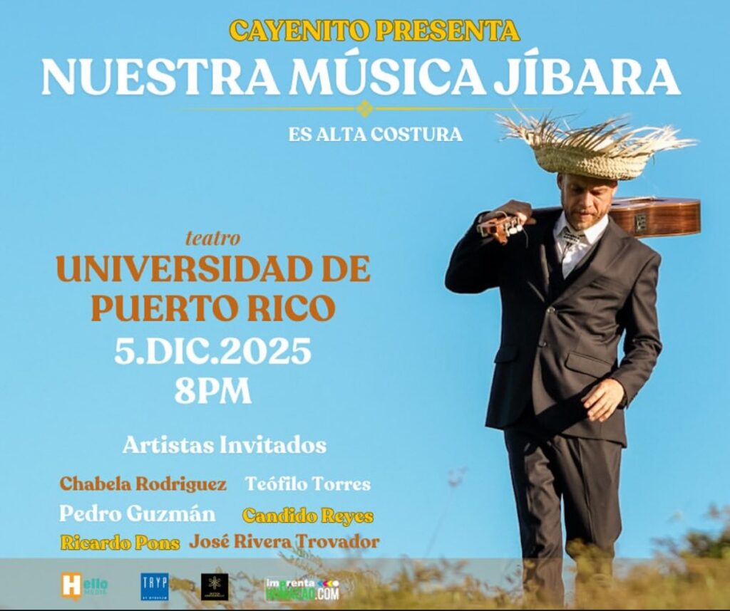 5 de diciembre: Teatro UPR, Río Piedras. Nuestra Música Jíbara es Alta Costura, un espectáculo que celebra nuestras raíces con actuaciones de Cayenito y artistas invitados como Chabela Rodríguez, Teófilo Torres, Pedro Guzmán, Cándido Reyes, Ricardo Pons y José Rivera “Trovador”. A las 8 p.m. Boletos en tiike.com.