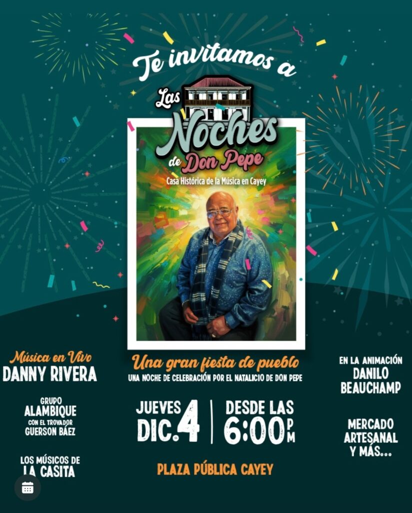 4 de diciembre: Casa Histórica de la Música, Cayey. Fiesta de pueblo dedicada al natalicio de una de las figuras más queridas de la Casa Histórica de la Música. Será una velada llena de música en vivo y tradición en la Plaza Pública de Cayey, con Danny Rivera, Los Músicos de La Casita, el Grupo Alambique y la animación de Danilo Beauchamp. Entrada libre de costo.