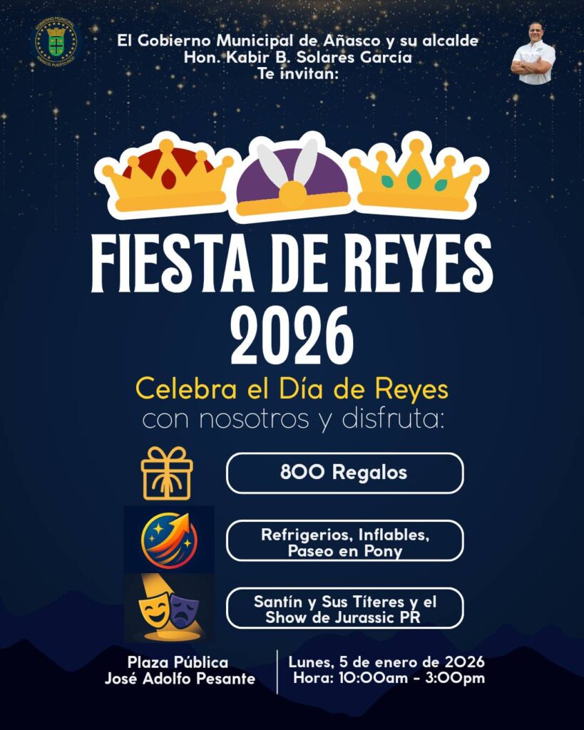El Gobierno Municipal de Añasco celebrará el Día de Reyes con una fiesta de pueblo, en la que contarán con 800 regalos, refrigerios, inflables, paseos en pony y la participación de Santín y Sus Títeres y el Show de Jurassic PR. De igual forma, los residentes de Añasco entre las edades de 5 y 18 años podrían hacerse de premios como bicicletas y Nintendo Switch Lites, que sortearán durante el evento.