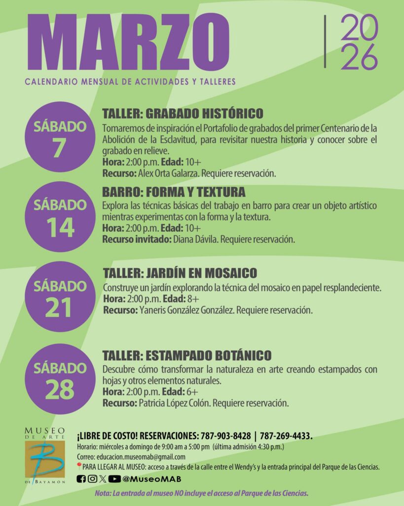 Todos los sábados, el Museo de Arte de Bayamón provee clases gratuitas para niños y adultos en diferentes medios artísticos. Visita sus redes sociales en Instagram y Facebook para conocer la agenda mensual. Para reservaciones, comuníquese al 787-903-8428 o al 787-269-4433.