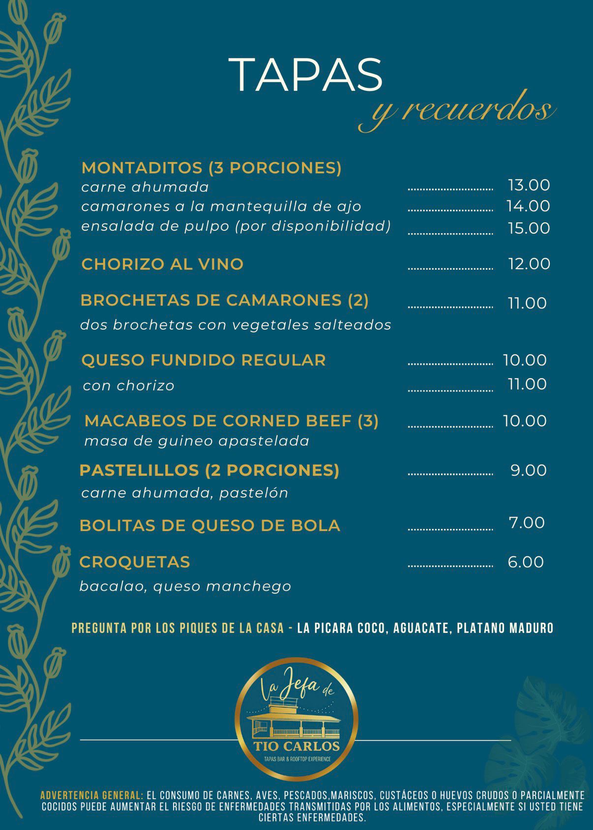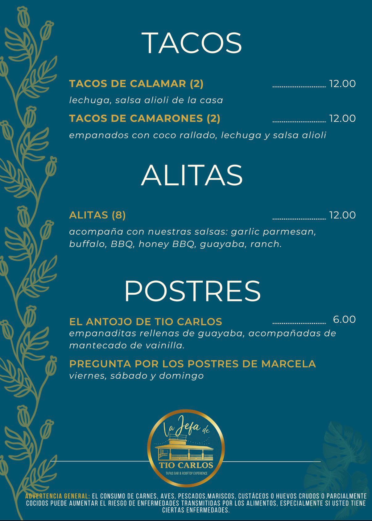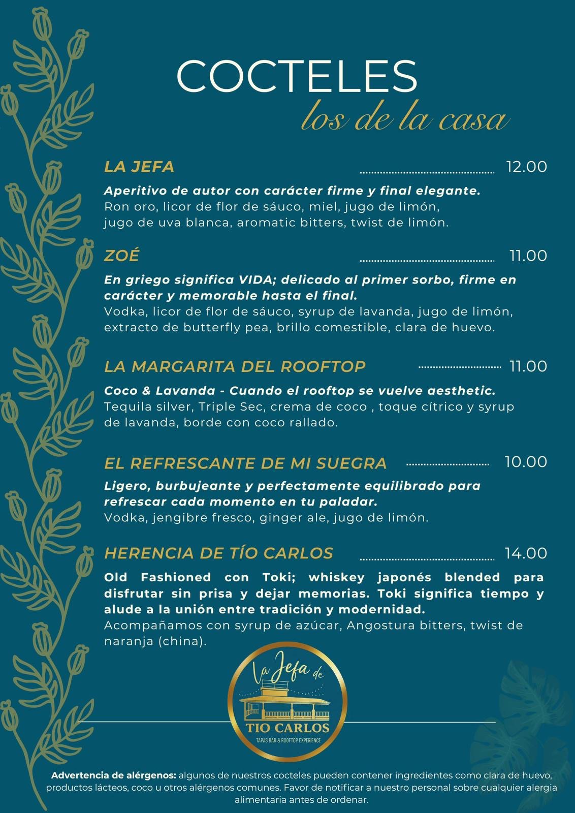 En el primer piso está lo que era el antiguo Tío Carlos Bar, un espacio estilo restaurante con mesas altas y bajas, barra y juegos para niños. En el segundo piso, está La Jefa de Tío Carlos, una terraza sofás y mesas altas, perfecto para tapear y probar cócteles.