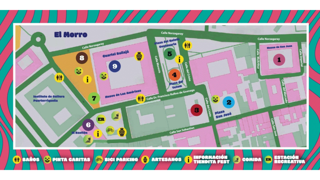 Además de la programación artística, habrá estaciones de pinta caritas para niños y jóvenes en el Jardín Paseo de Ballajá (8 – Zona Cuartel Ballajá en el mapa), en el Museo de las Américas y en la Plaza San José.