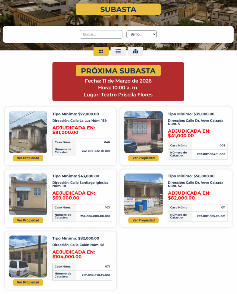 Segunda subasta: El 7 de abril, el alcalde Jaime Alverio Ramos anunció la fecha de la segunda subasta pública de estorbos públicos, a realizarse el 6 de mayo a las 10 a.m. en el Teatro Priscila Flores. En esta ocasión, habrá nueve propiedades declaradas estorbo público con precios que van de $9,000 a $99,000.