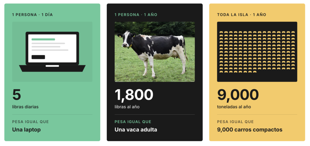 ¿Qué está pasando? En Puerto Rico cada persona produce cerca de 5 libras de basura cada día, equivalente a lo que pesa una laptop. Esto se convierte en más de 1,800 libras por persona al año o lo que pesa una vaca adulta y en más de 9,000 toneladas de desperdicios anuales en la isla, lo que pesan 9,000 carros compactos.